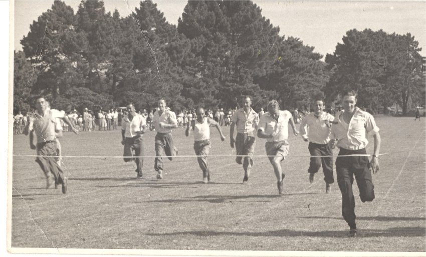 Bill Connor is about to reach the finish line. Other runners include Turoa Webster, Rex Nicolson and Jack McLeod.