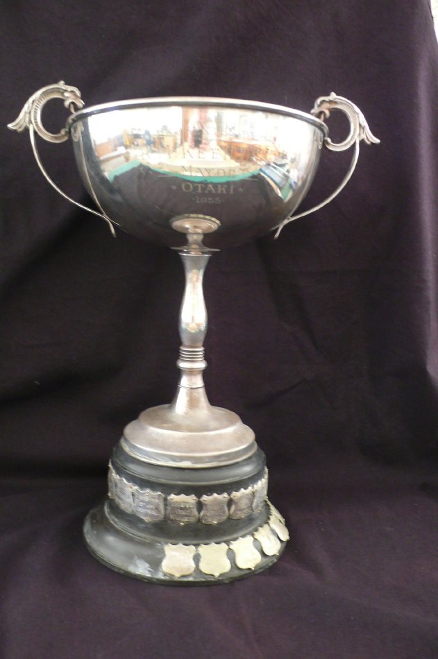 Engraved with the words "Presented By R. McKeen. Esq - Mayor Otaki 1955". Fixed to the base are 23 silver medallions engraved with date and club name.