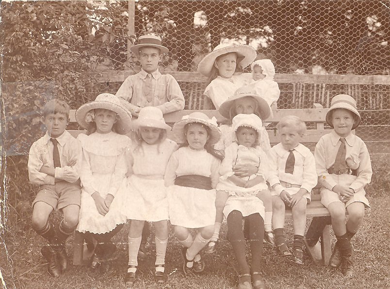 LtoR: Waldyve St. George, Rena Stevens holding Sybil St. George, Keith St. George, two Hartman girls, Molly Jensen, Joyce Booth holding Patricia Jensen, Bernie Petrie and Pat O'Rourke.