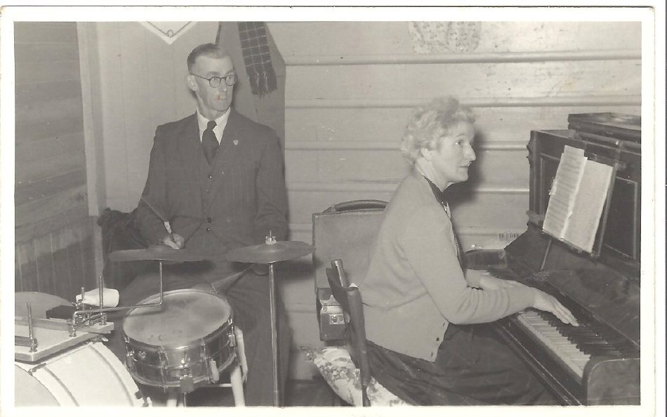 Maude and Herbert Tews playing piano and drums at a dance, 1950s