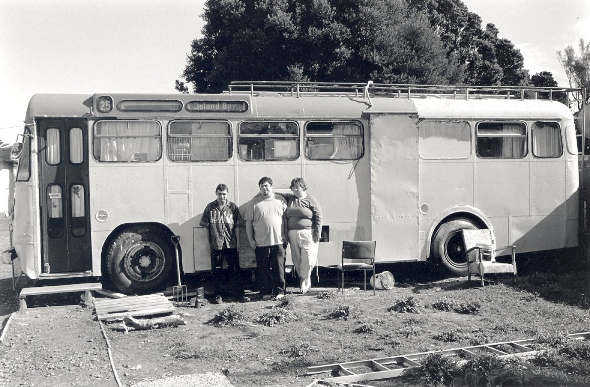 Permanent residents Daniel Jetson, David Ford and Stacey Stevenson outside their house-bus.