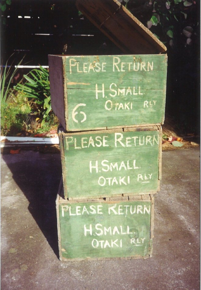 Produce boxes belonging to Harold Small, a local farmer and horticulturist.