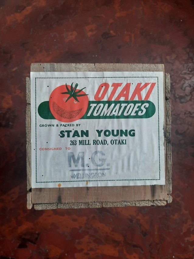 An empty 'Otaki Tomatoes' wooden tomato box with the label of Stan Young's market garden, 263 Mill Rd, Otaki. (1960 - 1980)