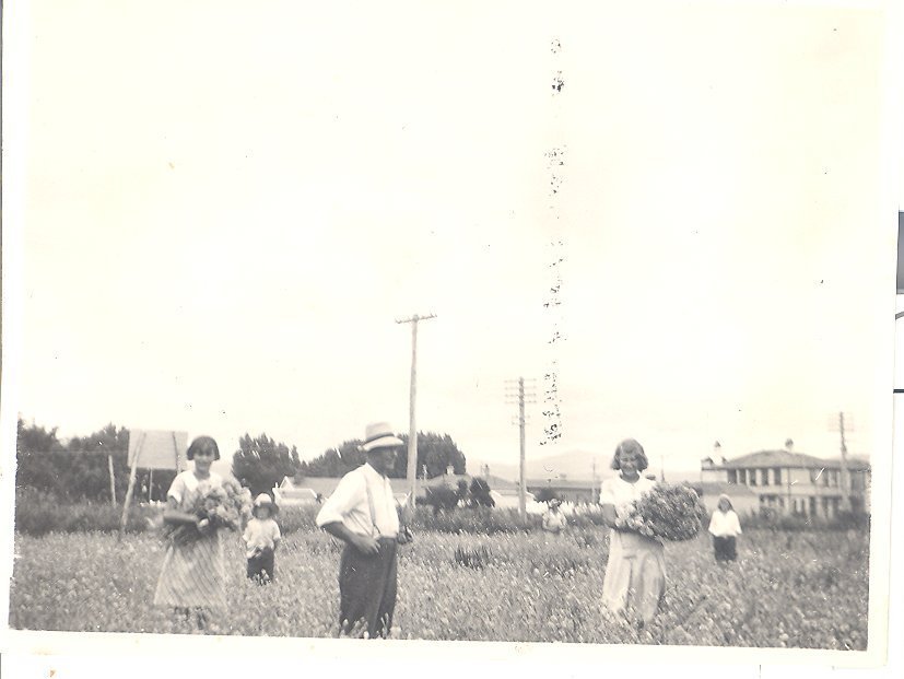 The Railway Hotel can be seen in the distance. Shown in the photo gathering flowers are Phylis and Ray Moffatt (children, left), Winston (man wearing braces and hat, centre) and three other people (one is probably Julia Moffatt, the grandmother of Ray and Phyllis).