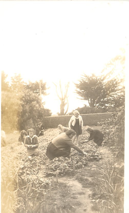 School girls picking violets at Rangiuru Road, Otaki, 1945.