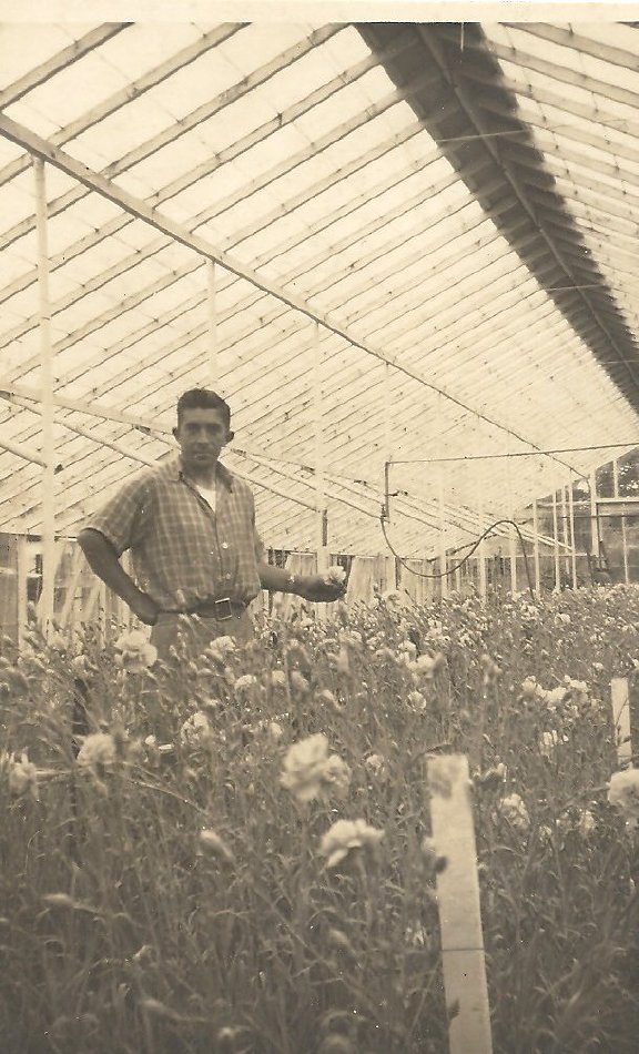 Gabby Goldsmith, standing in his glasshouse amid a display of carnations.