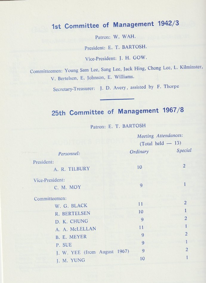The Committee of Management, under the Presidency of A.R Tilbury constitutes C.M Moy ( Vicepresident) W.G Black, R. Bertelsen, D.K Chung, A.A Mclellan, B.E Meyer, P Sue and J.M Yung, J.W Yee