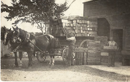 Justin Pescini on brake, Fred Bertelsen handing up crate, Tom Pescini standing near shed door. The draught horses are named Ginger (at front, Bertelsen horse) and Darkie (at rear, Pescini's).