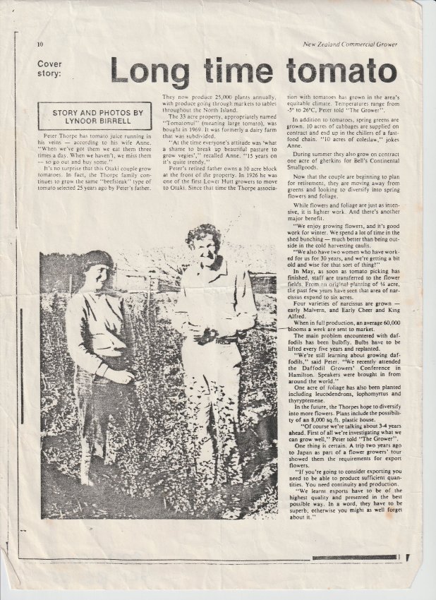 The article talks of the Thorpes' transition from tomato growing into flower growing at their property "Tomatanui" in Ringawhati Road, Otaki.