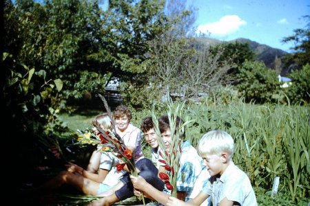 - Digital copy of a photo of the Gordon family bunching gladioli for market.