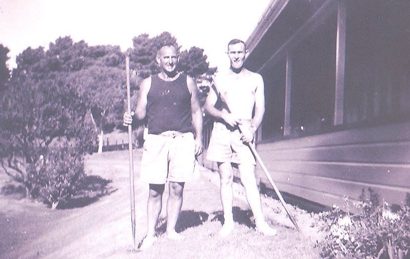 Bill Watson & Noel Bagant, keeping the gardens at the Otaki Sanatorium. 1953.
