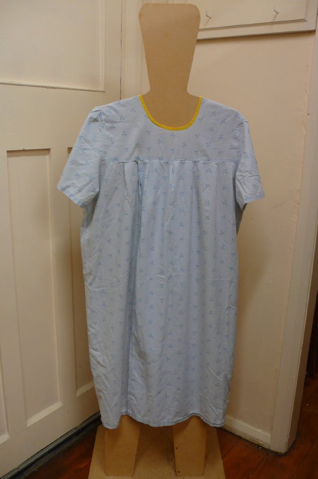 Hospital gown for maternity wear. The gown has short sleeves, short bodice with a pleated skirt attached and a front opening for ease of breastfeeding, also a back opening.