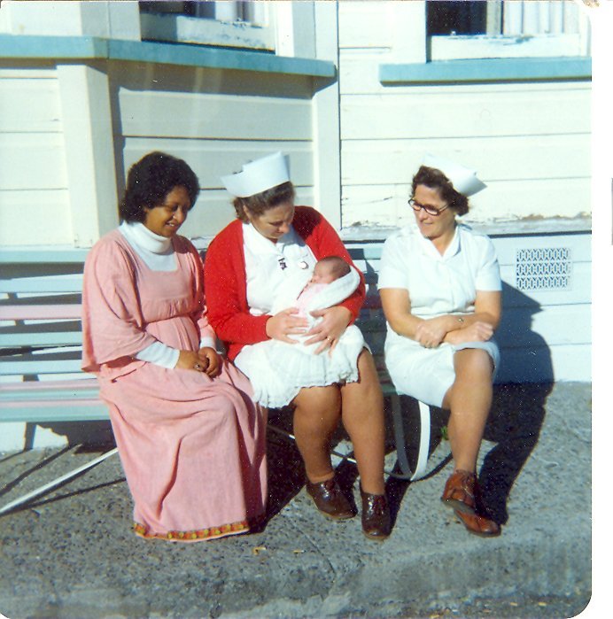 Diana Moffatt, Gloria Johnston holding baby Katherine Moffatt and Pam Snowden at Otaki Maternity Home, See OHJ vol 42 page 40