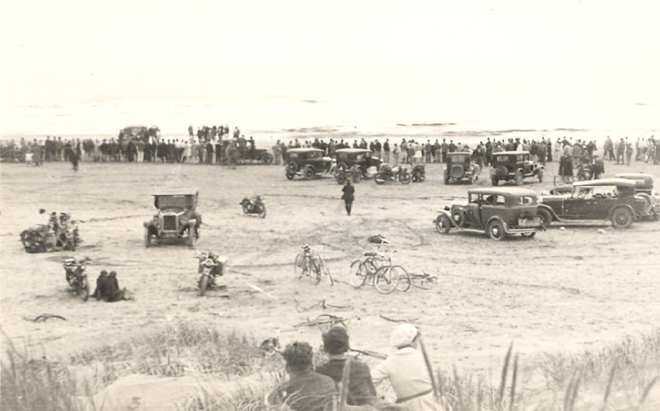 Visitrors drove their cars or drove their motor cycles or bicycles onto the beach, then stood around or sat in the sand dunes to watch.