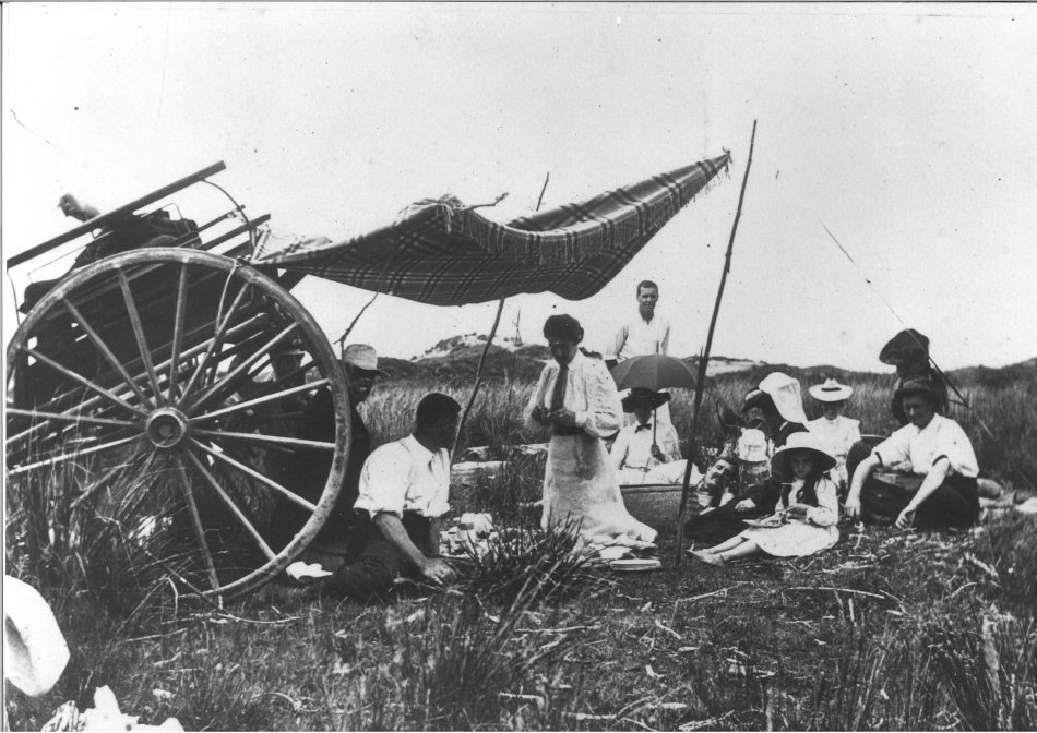 A Simcox family picnic on Otaki Beach north of the Waitohu Stream about 1918. The Simcox family lived on a large property, Forest Lakes, just norh of the Otaki township.