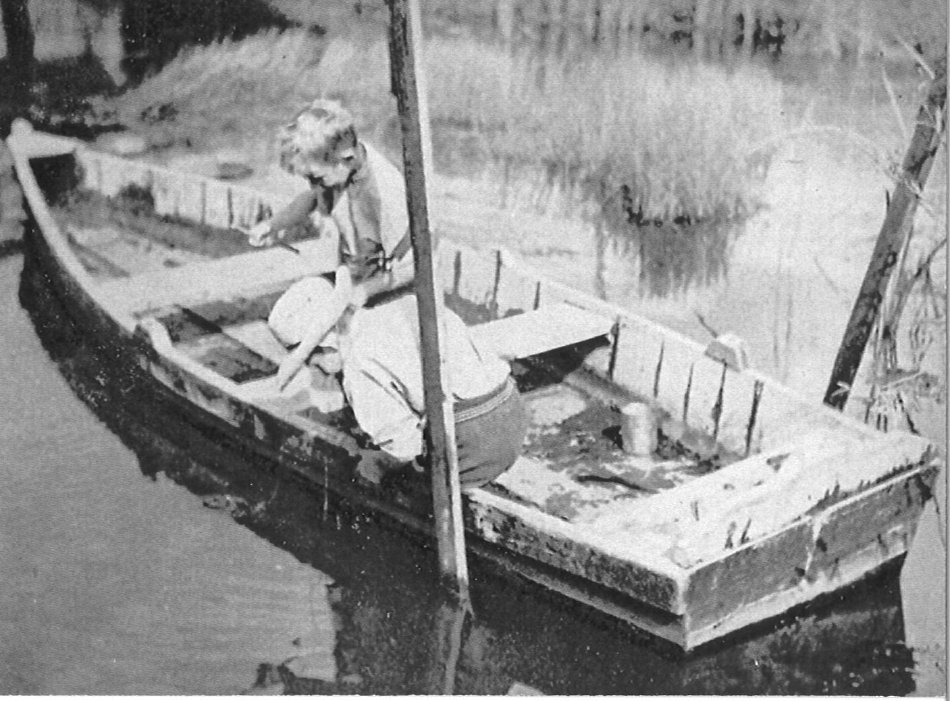 David Cook (with hat) and George Taucher playing in the Cook's Boat, Rangiuru Stream, 1940s.