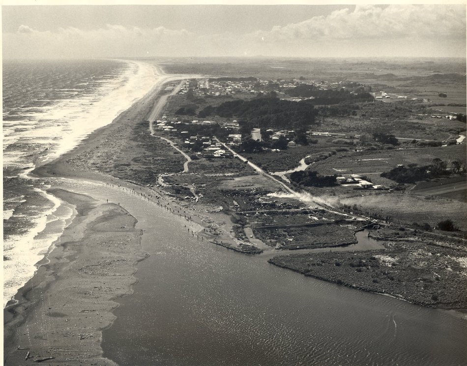 Aerial view of Otaki river mouth during whitebaiting season, October 1974.