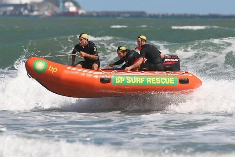 Otaki Surf Lifesaving Club: IRB (inflatable rescue boat) Senior Tube Rescue race in 2011 with Brad O'Leary driving.