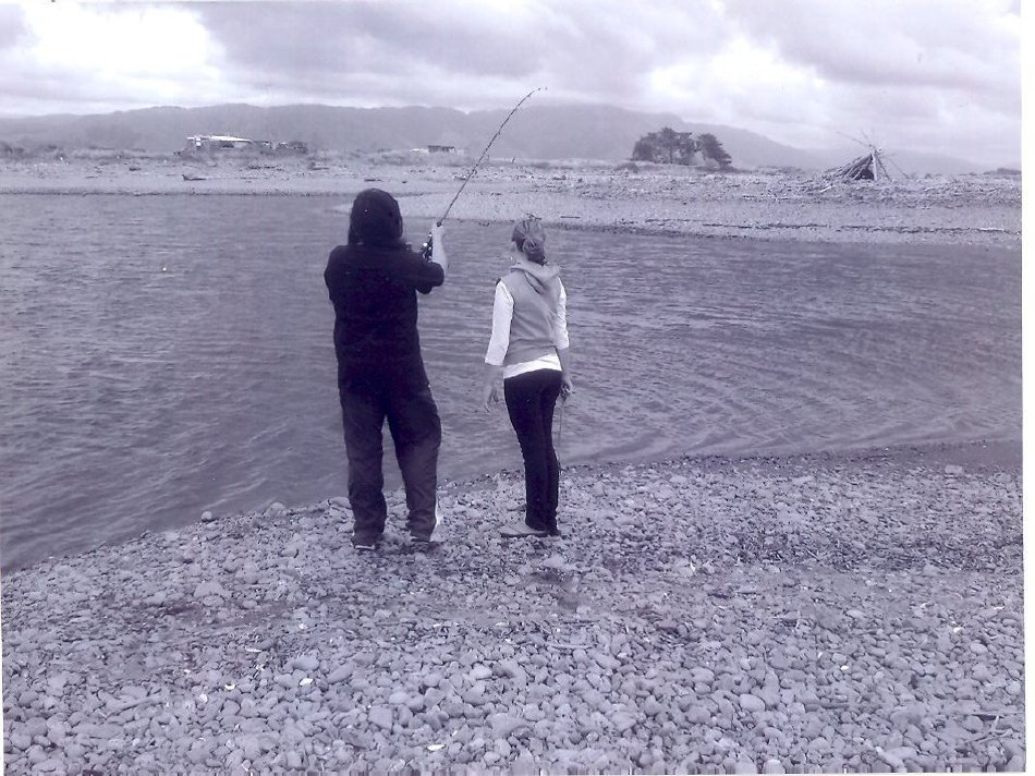 Kane Tawhara and Ursula Stevenson surfcasting at Otaki River mouth, 2009.
