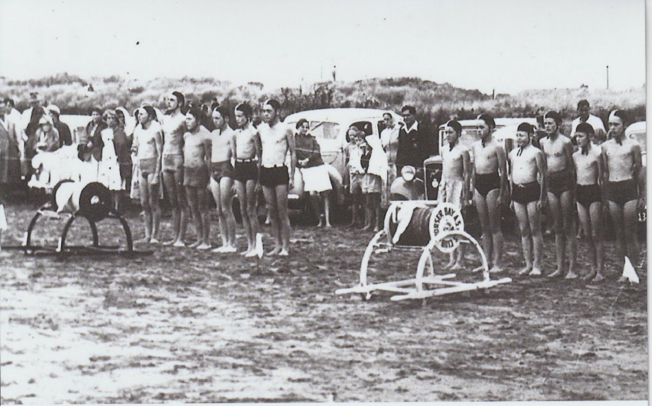 Otaki Surf Lifesaving 6 man Resuce & rescuitation team, 1950, on the left. Worser Bay team on right.