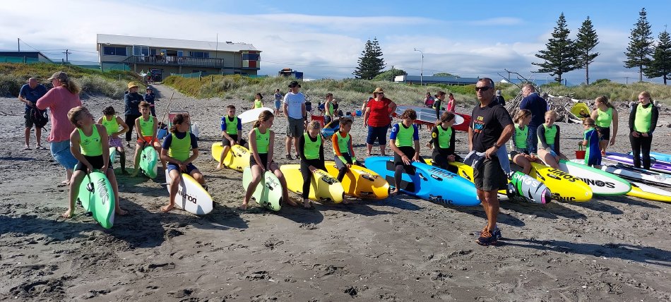 Children and Surf Club members at the end of season's nipper carnival at Otaki Beach, 2022.