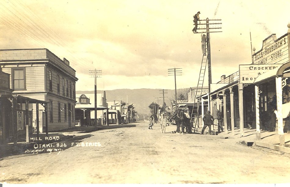 Postcard of Mill Road/Main Street Otaki looking East, with linesmen working on telegraph lines.