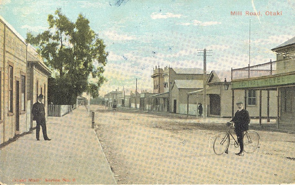 Coloured postcard (postmarked 1914) of Main Street, Otaki, looking west. On the left are the Otaki Mail and Bank of Australasia buildings. On the right is the Central Hotel on the corner of Aotaki Street.