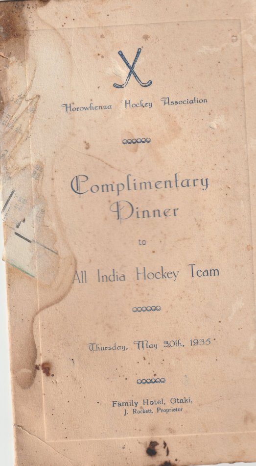 Menu Card for a complementary dinner held for the All India Hockey Team at the Family Hotel, 30 May1935. The Horowhenua Hockey Association hosted the event.