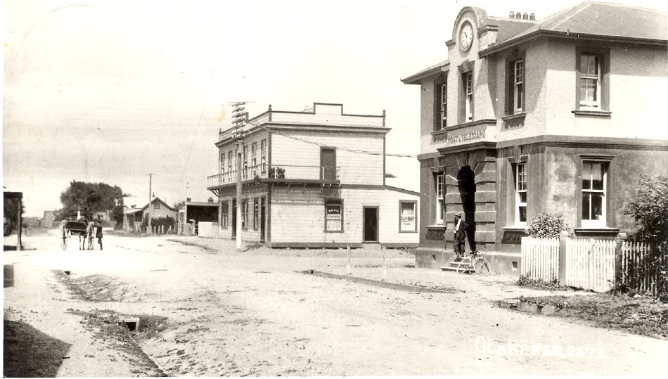 Looking south past the Post Office and Telegraph Hotel down Rangiuru Road. 1914